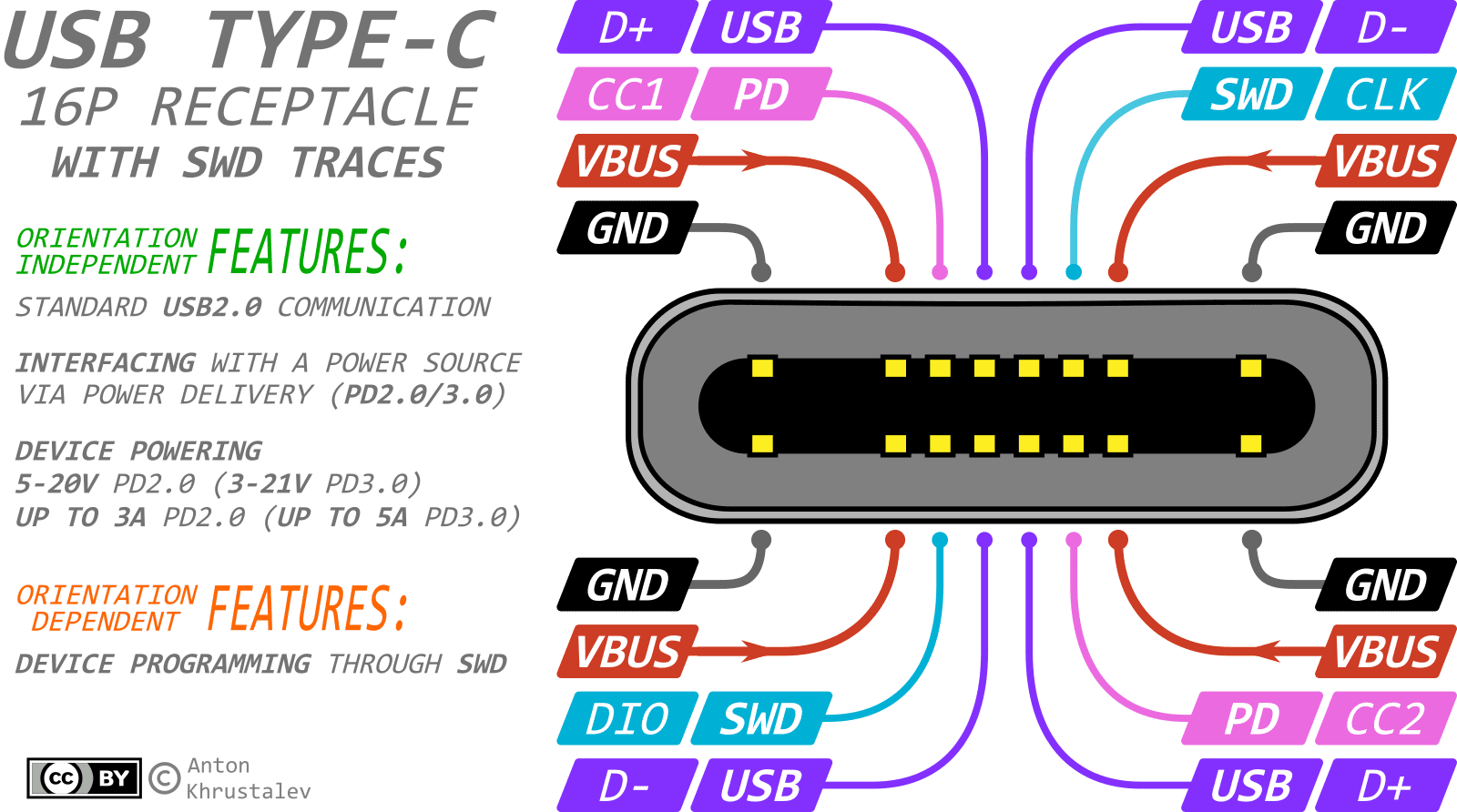 Pins Usage 8 pins Power (4 for GND and 4 for VCC). There's a potential limitation to 3A – this requires confirmation. 4 pins Orientation-independent USB 2.0 (2 each for D+ and D-) 2 pins CC1 and CC2 (Configuration Channel) for PowerDelivery communication 2 pins SBU1 and SBU2 (SideBand Use). Usually dormant, except in 'alternate mode' or specific Audio Accessory Modes. Employing PowerDelivery can yield voltages and currents ranging from: