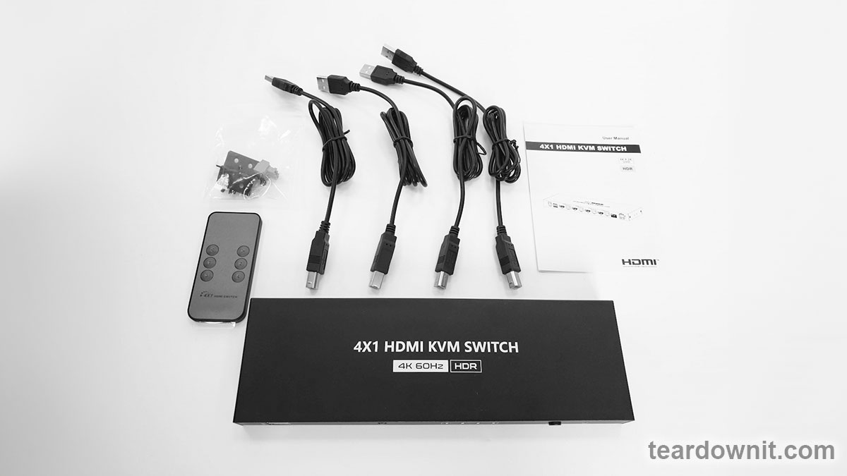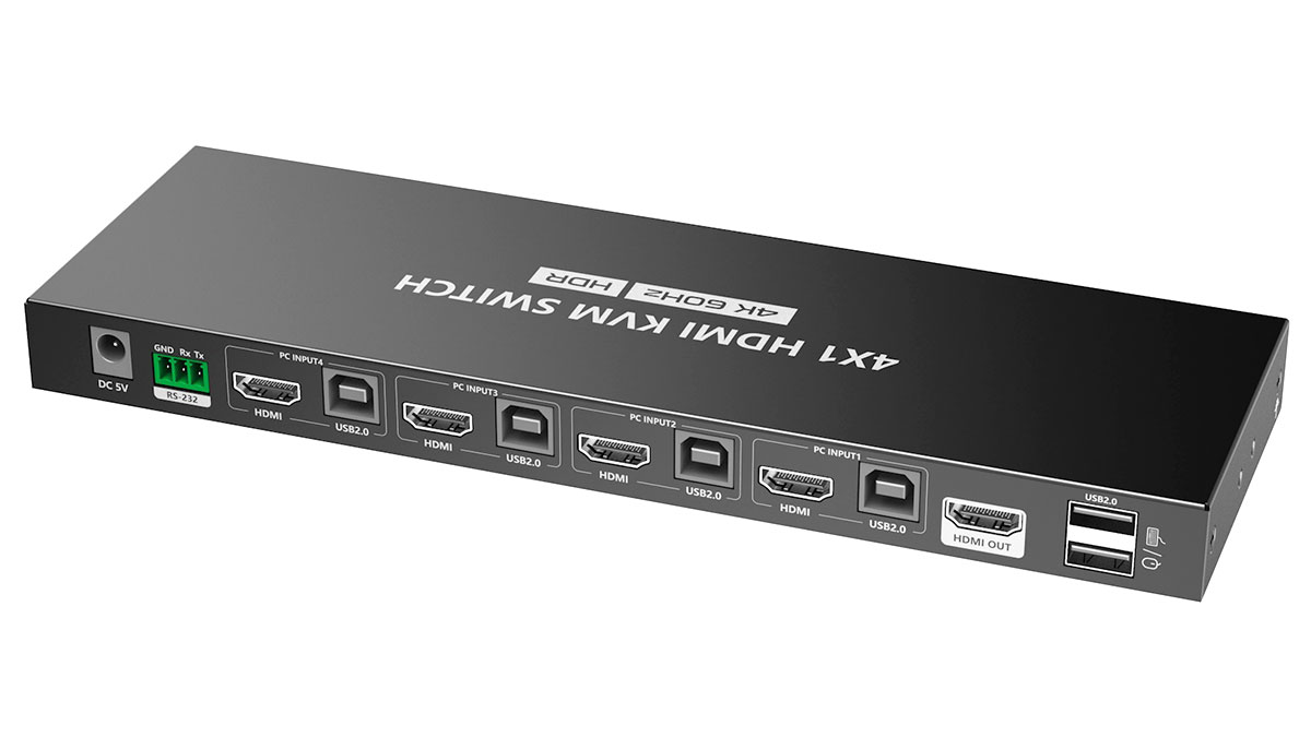 INRIKS SW4041KVM is a 4-to-1 HDMI KVM switch. That means one can connect 4 PCs (HDMI outputs and USB ports) and one set of monitor and USB HID devices like a mouse and keyboard for the user.