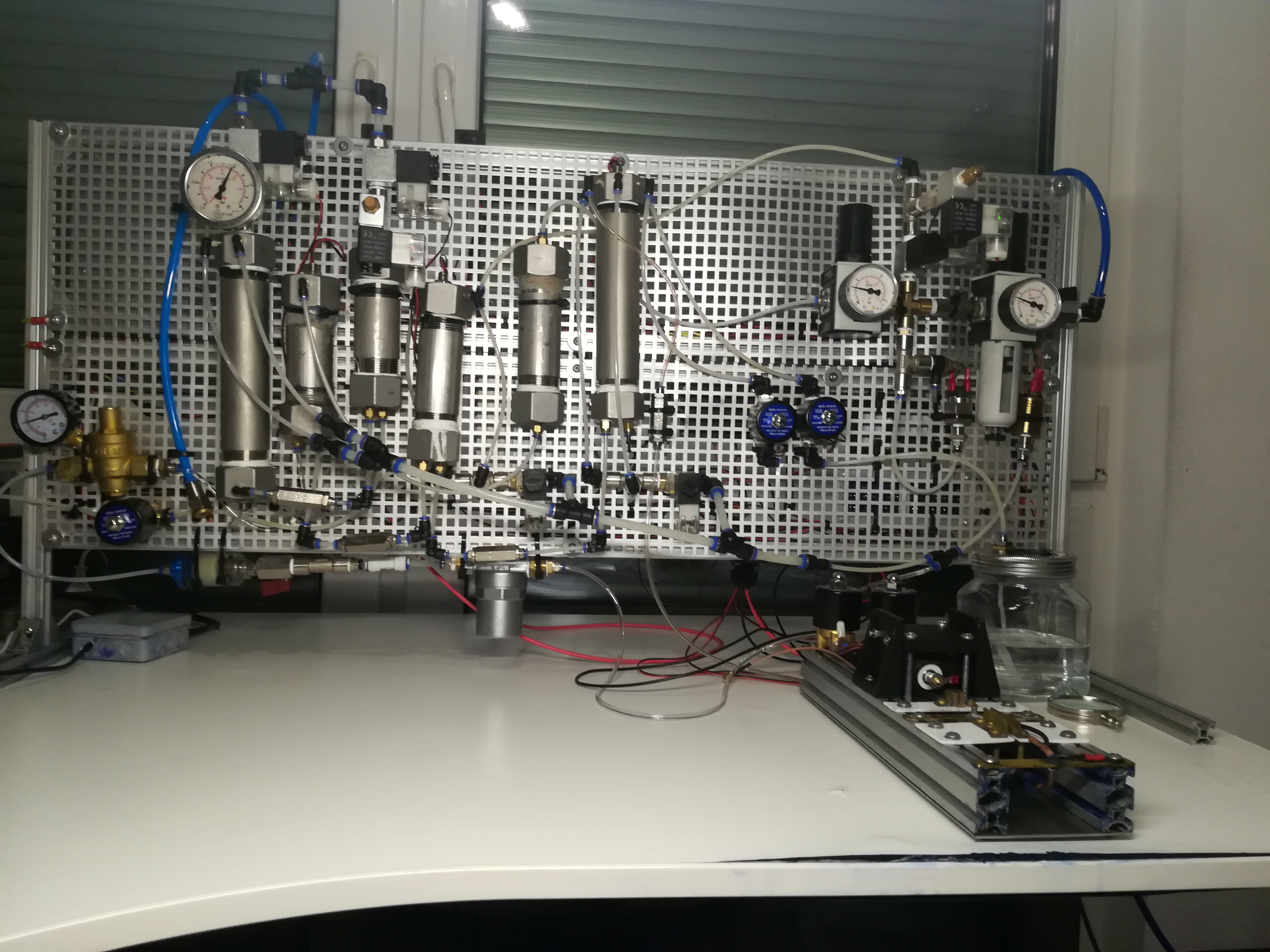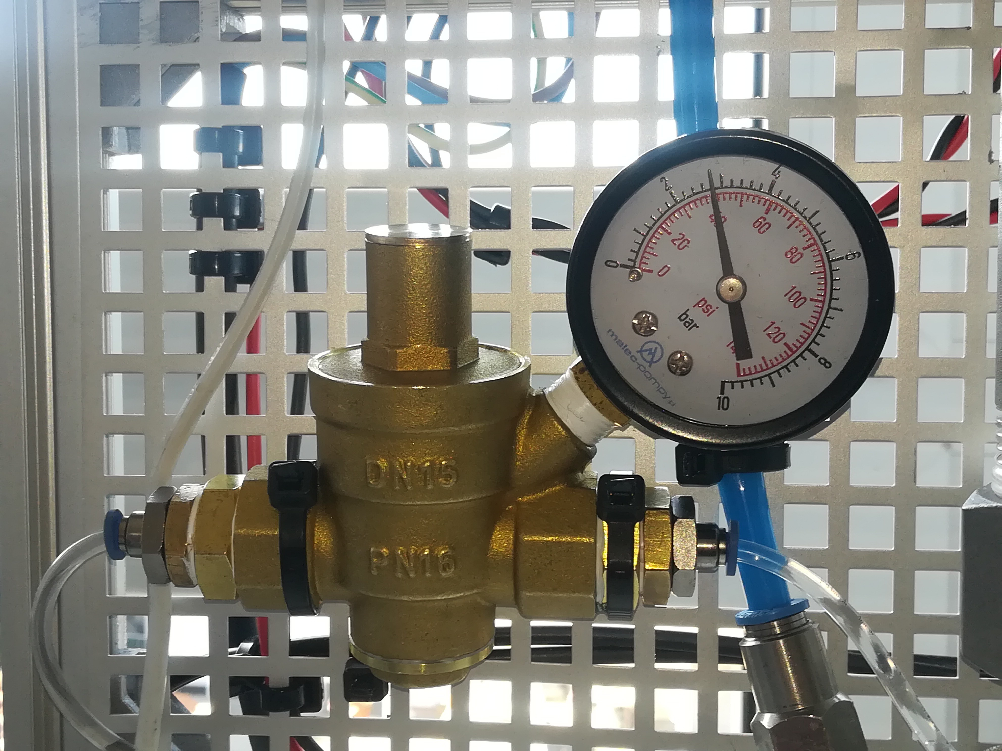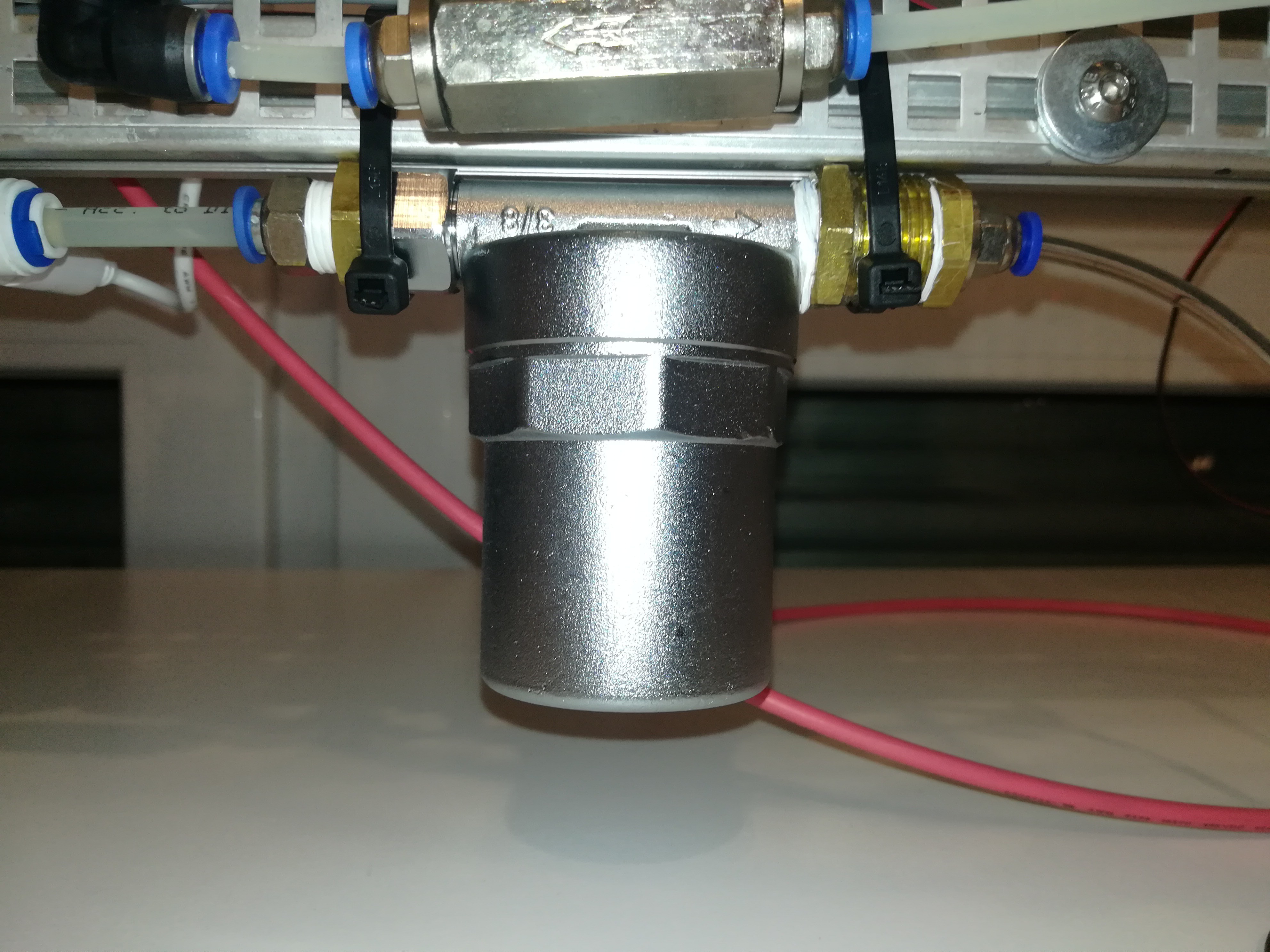 From the ink mixing chamber the ink gets transfered to a viscosity measuring cylinder by a pneumatic rubber pump. The ink cylinder is pressurized and connected to the nozzle which has a valve that stays closed until it reaches a certain pressure to prevent the ink from dripping from the nozzle when not under the right pressure. The pneumatic driven rubber pump is driven with 1 bar above set ink pressure to be able to pump the ink into the cylinder through an ink filter. The pump also has check valves at the in and outlet.