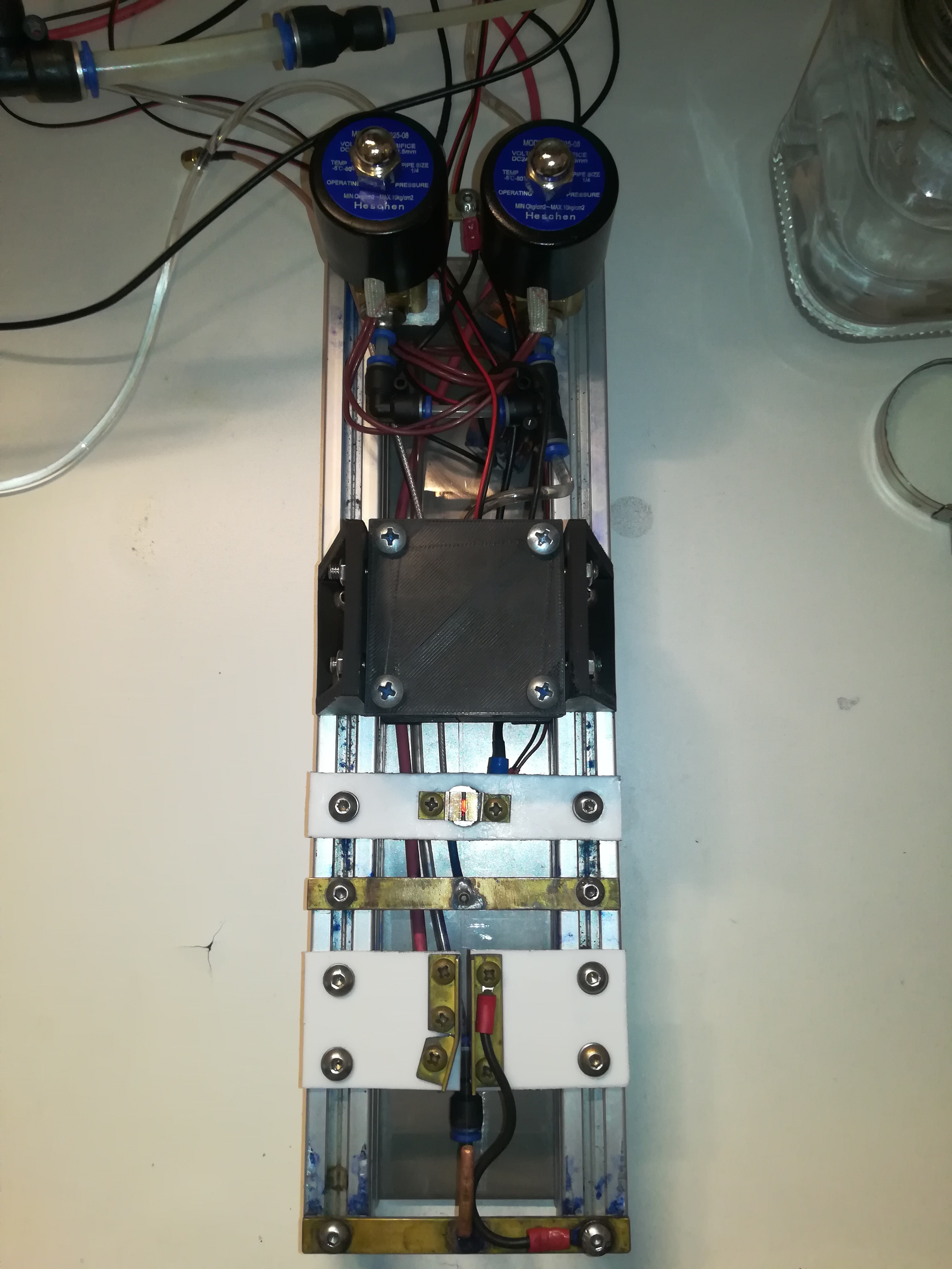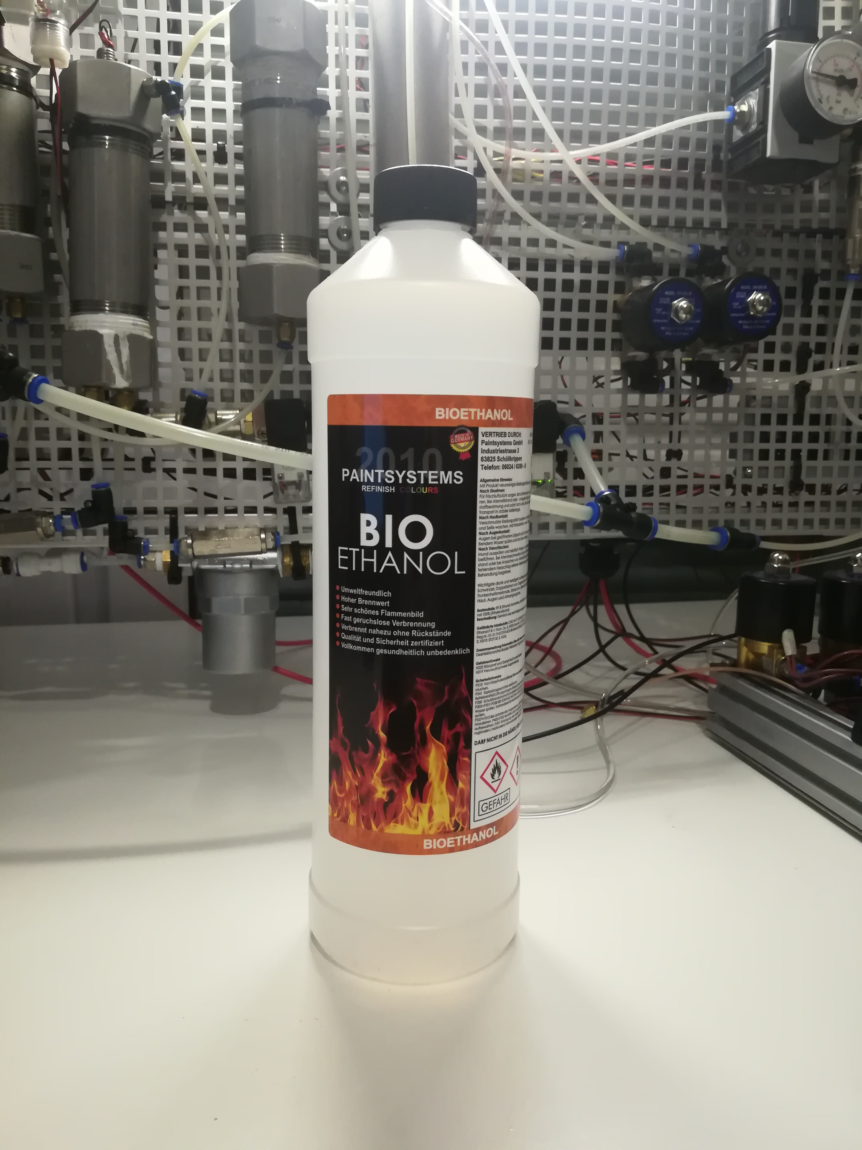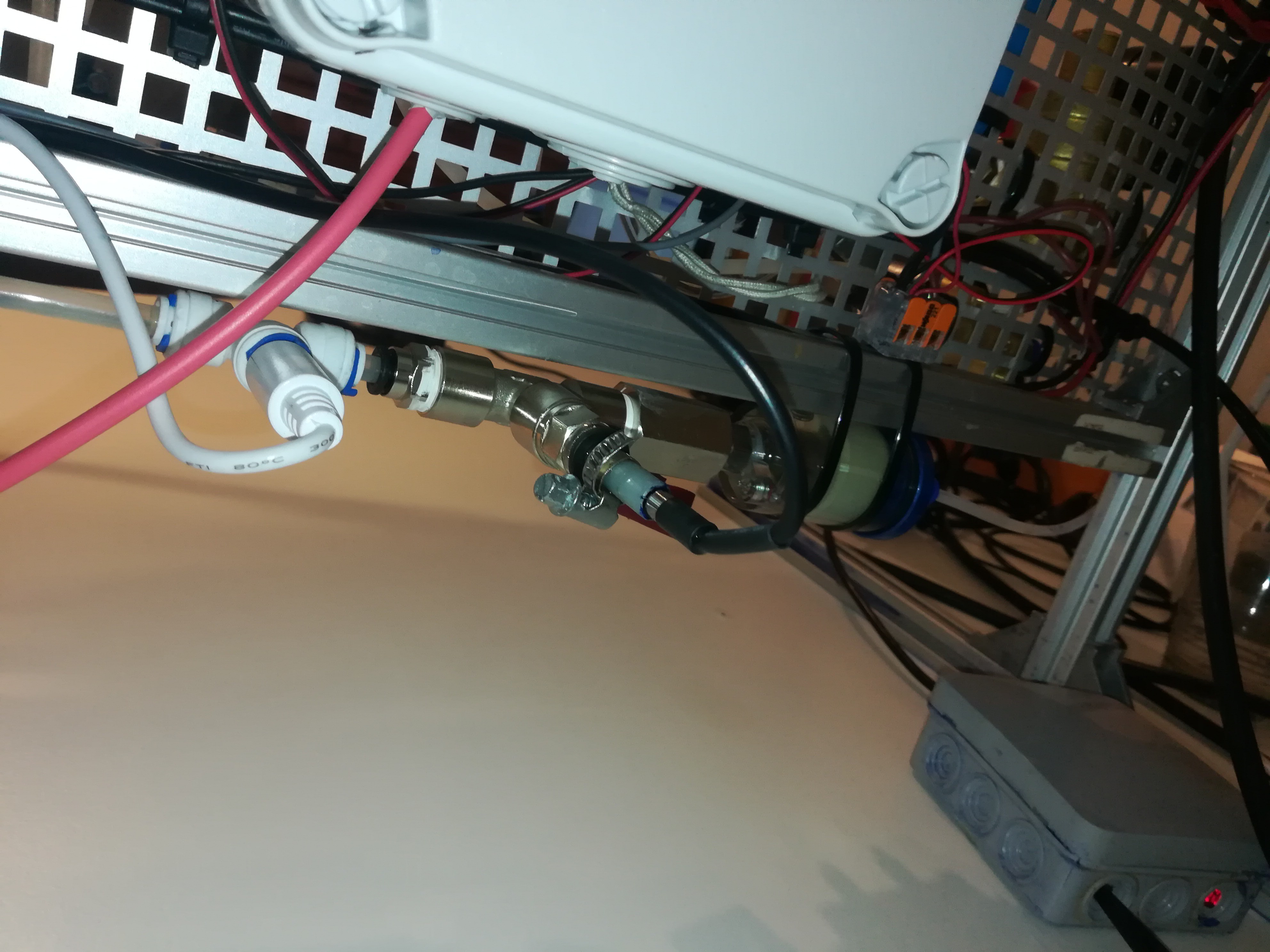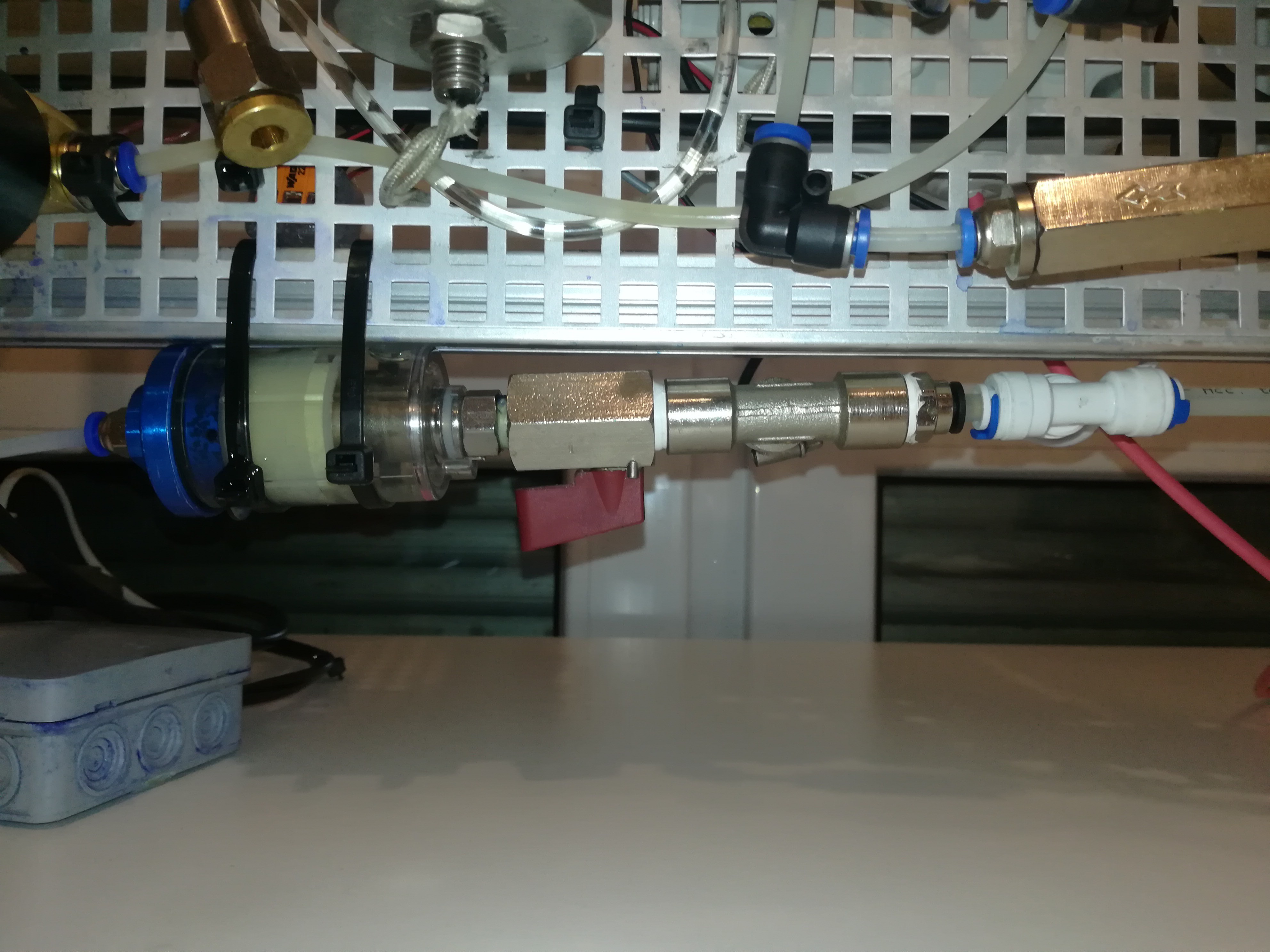 From the ink mixing chamber the ink gets transfered to a viscosity measuring cylinder by a pneumatic rubber pump. The ink cylinder is pressurized and connected to the nozzle which has a valve that stays closed until it reaches a certain pressure to prevent the ink from dripping from the nozzle when not under the right pressure. The pneumatic driven rubber pump is driven with 1 bar above set ink pressure to be able to pump the ink into the cylinder through an ink filter. The pump also has check valves at the in and outlet.