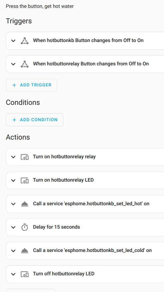 - Home Assistant automation is used to tie it all together. It senses a press on any of the remote call buttons, activates the relay, and provides visual feedback via the RGB LEDs on the remote call buttons.