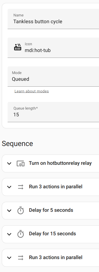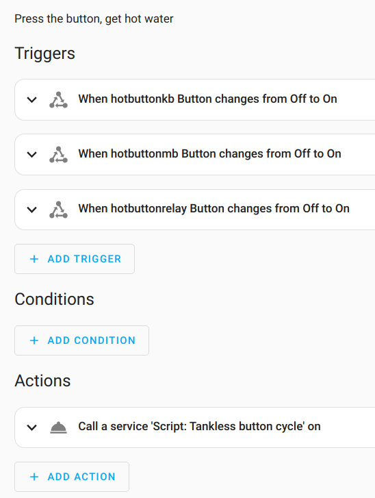 I previously described a project I implemented for monitoring the (finicky) pilot light in my water heater. That water heater is reaching end-of-life, and I'm replacing it with a tankless water heater. The old water heater had an external recirculation pump that operated on a timer, though I eventually integrated my scheme with Home Assistant and plugged the pump into a smart outlet so that I could let household members push a button to call for hot water when it wasn't in the timer window. That on-demand feature has been reasonably well-received.