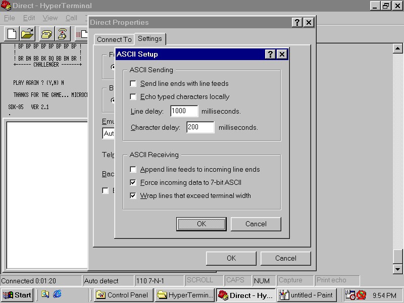 Having no other options, I pulled out an old DOS machine with a physical serial port and was greeted with an "SDK-85" prompt. Success... sorta.