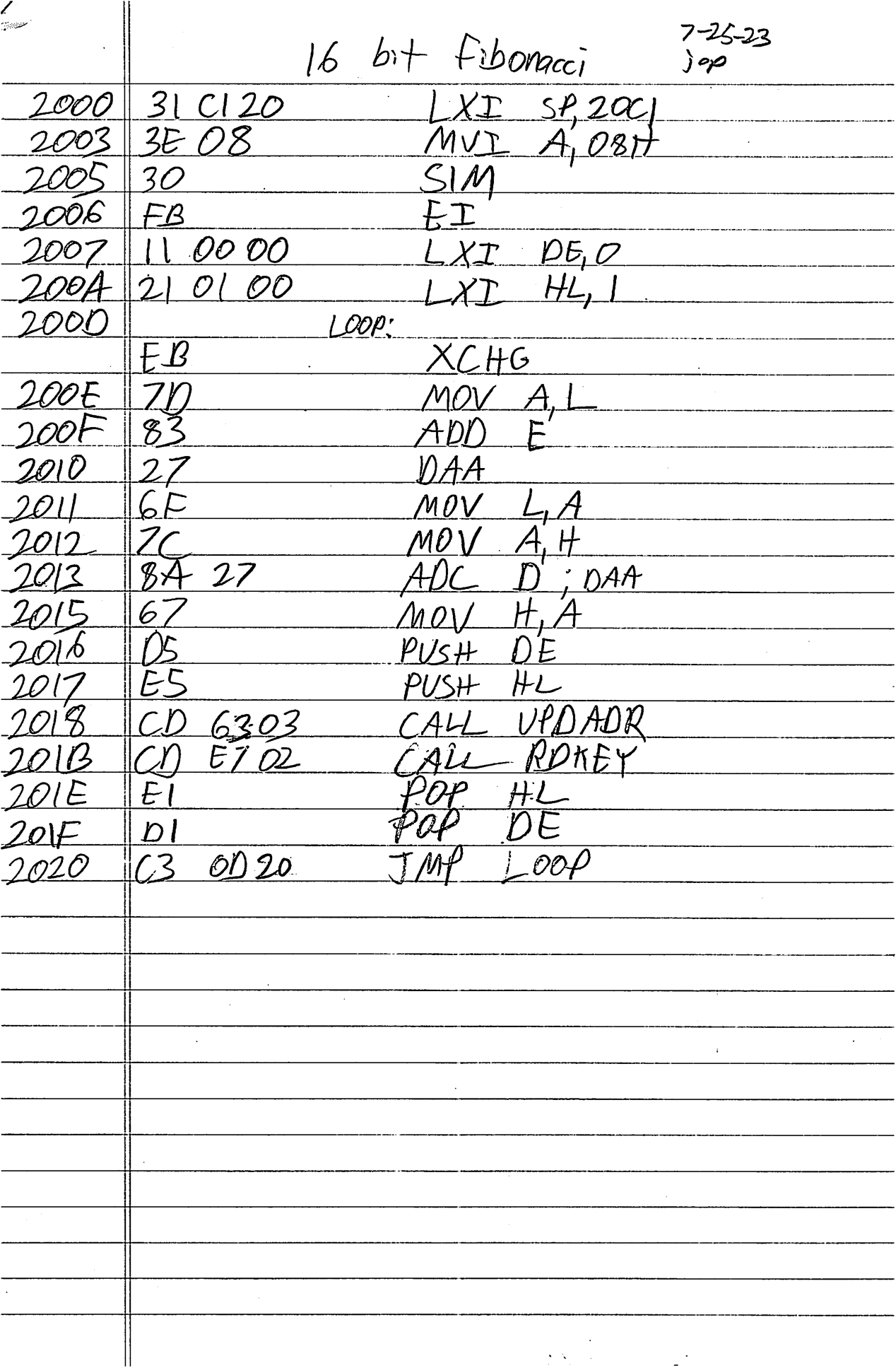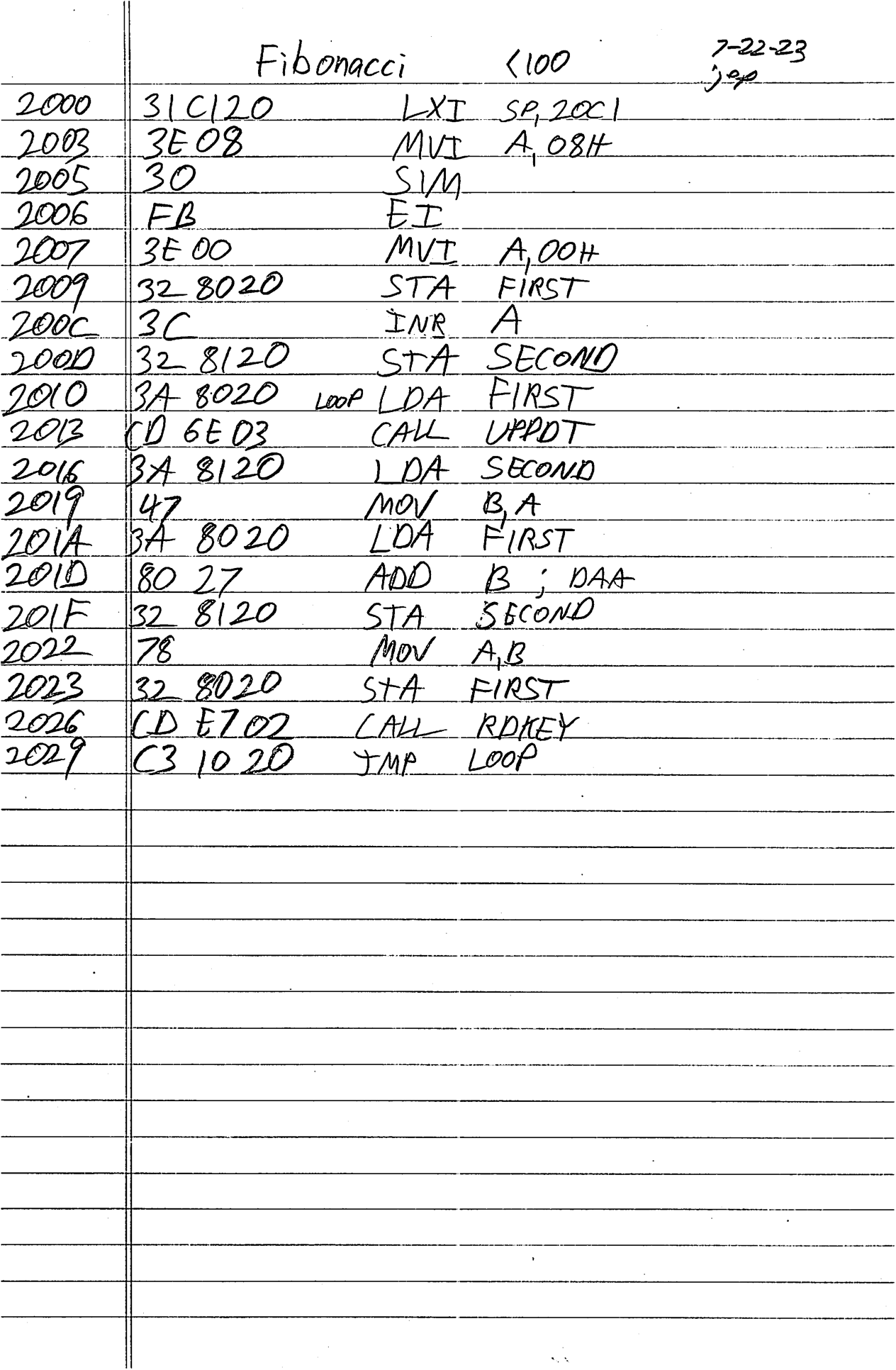 Next, it was time to get familiar with programming the SDK-85. As I often do when learning a new language, I decided to do a math problem. Prime finding is my go-to, but with a 7 segment display I decided to go for something less verbose. So, Fibonacci sequence it is.