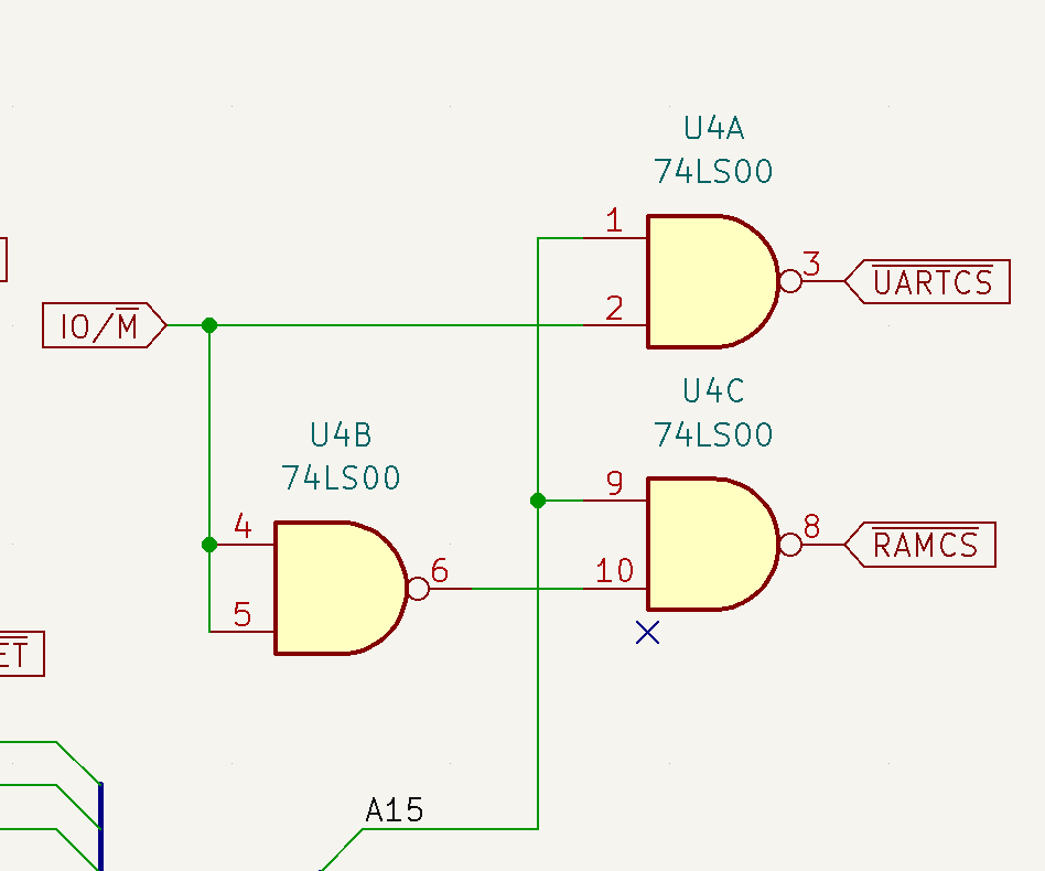 Intel made it very easy to add things into the upper 32K. My glue logic is implemented in a single 74LS00, with one gate to spare The RAM is enabled if A15 is high and IO/M is low. The UART is enabled if A15 is high and IO/M is high. The 62256 and 8251 use Intel-style /RD and /WR lines, so no additional glue was needed.