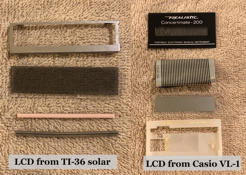 I've posted this project in response to davedarko's D1867G based keyboard hacks here at HACKADAY.IO. I acquired a Casio VL-1 from Ebay for $20. However the LCD was unreadable due to the method that was used to connect it to the main PCB board. In davedarko's log he describes a method to use a zebra pressure strip to re-attach the connection. His log shows a newly created PCB to use with the zebra strip. In this variation, I've used an old TI-36 solar calculator to provide the pieces for that connection. I was quite surprised how it all came together!