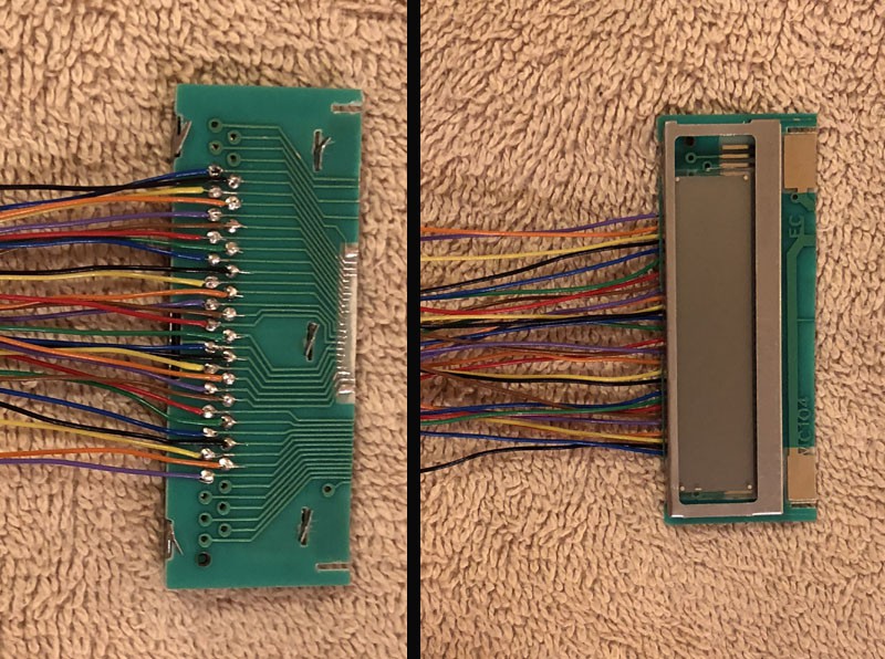 The main PCB of the Casio still had a few places where the old adhesive needed to be removed. After a bit of scraping I was able to connect the two boards together. This picture shows the results after the first atempt. Later, I trimmed all the wires to about half the length that you see in the photos. Also, I reoriented the direction of the wires from the Casio keyboard PCB so that they point 180 degrees from the position in the photos. The unit then fit together much better after I did that.