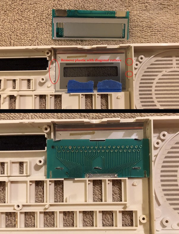 I used some isopropyl alcohol to remove the adhesive from the Casio glass. I could see the contacts on the glass and I lined up the 2 pieces so that the Casio's LCD was aligned with the contacts on the calculators circuit board. I trimmed the board - and this is where I was extremely lucky - so that it would eventually line up perfectly with the display cutout in the front bezel.