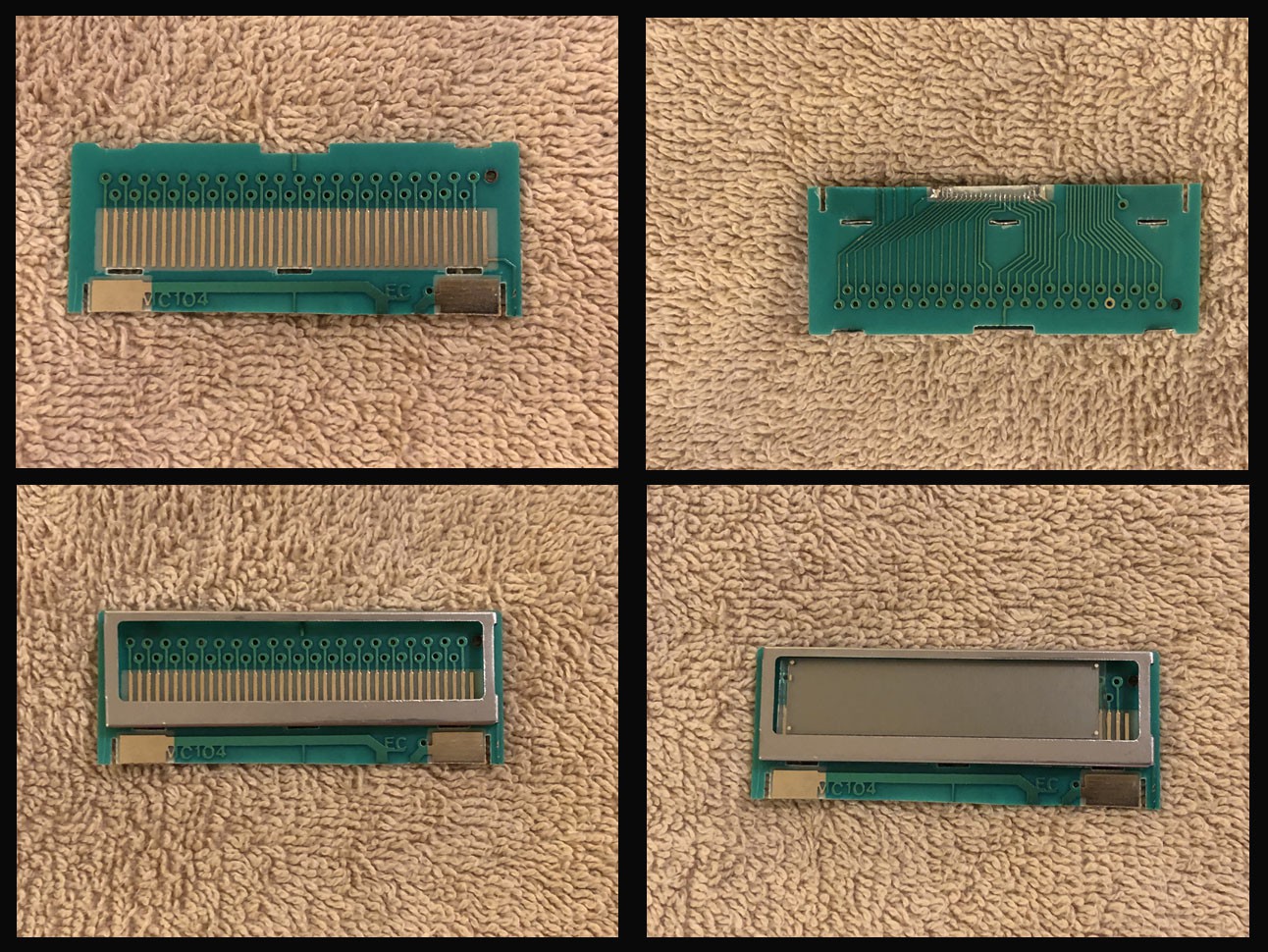 The LCD in the Casio is connected by a flimsy flex cable with 29 carbon traces emmbedded into the plastic - (see Dave's log). It was, and I guess still is, a very common way to connect an LCD to a circuit board. But over time the connection becomes brittle and the adhesive that holds the flex cable to the LCD and PCB gets old and falls apart. In my opinion, the connection used by many calculators - including this one, has better longevity. It uses an elastic zebra strip that press fits up against the circuit board to make the connection. A small tin frame bracket fits over the glass LCD to press the contacts together.